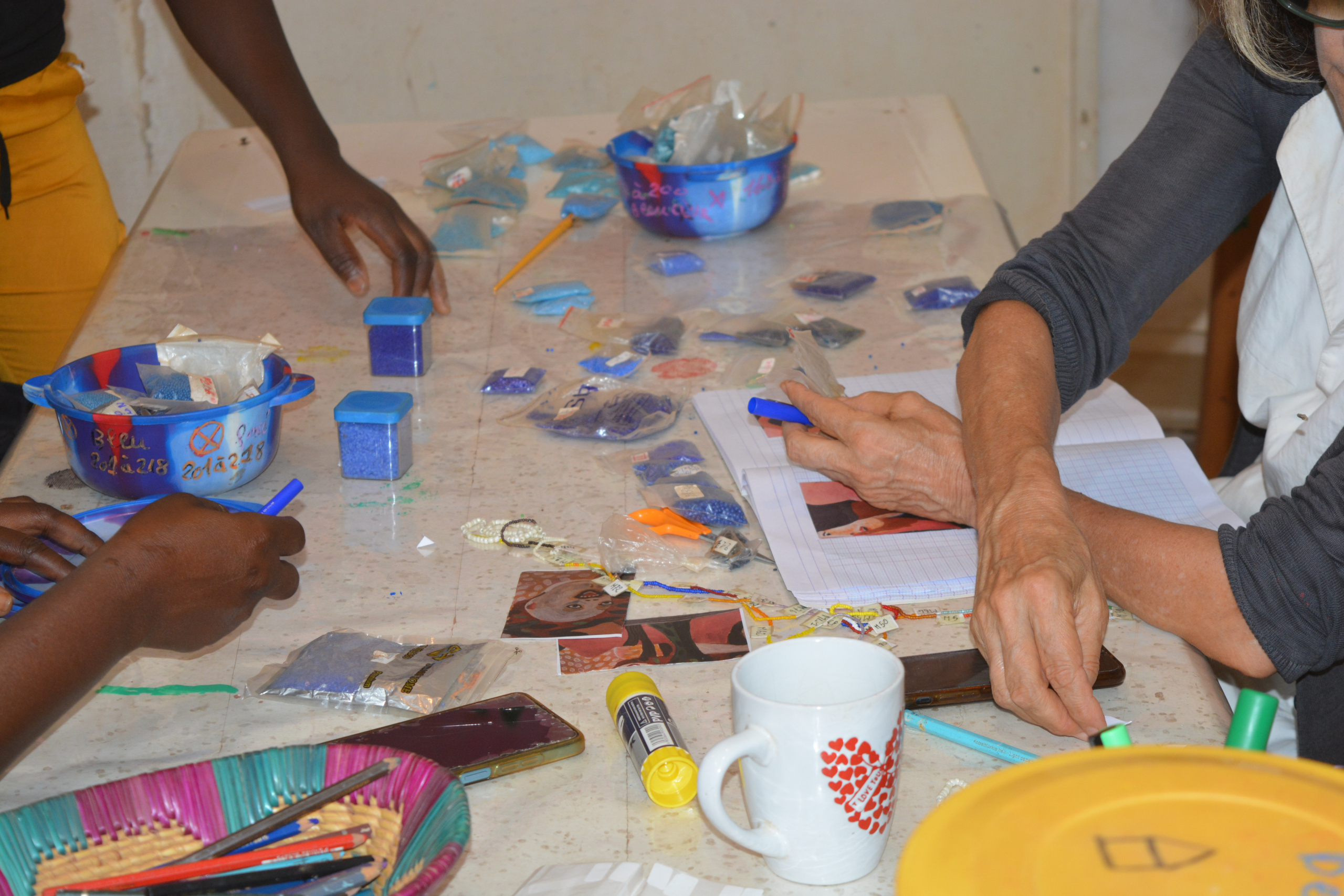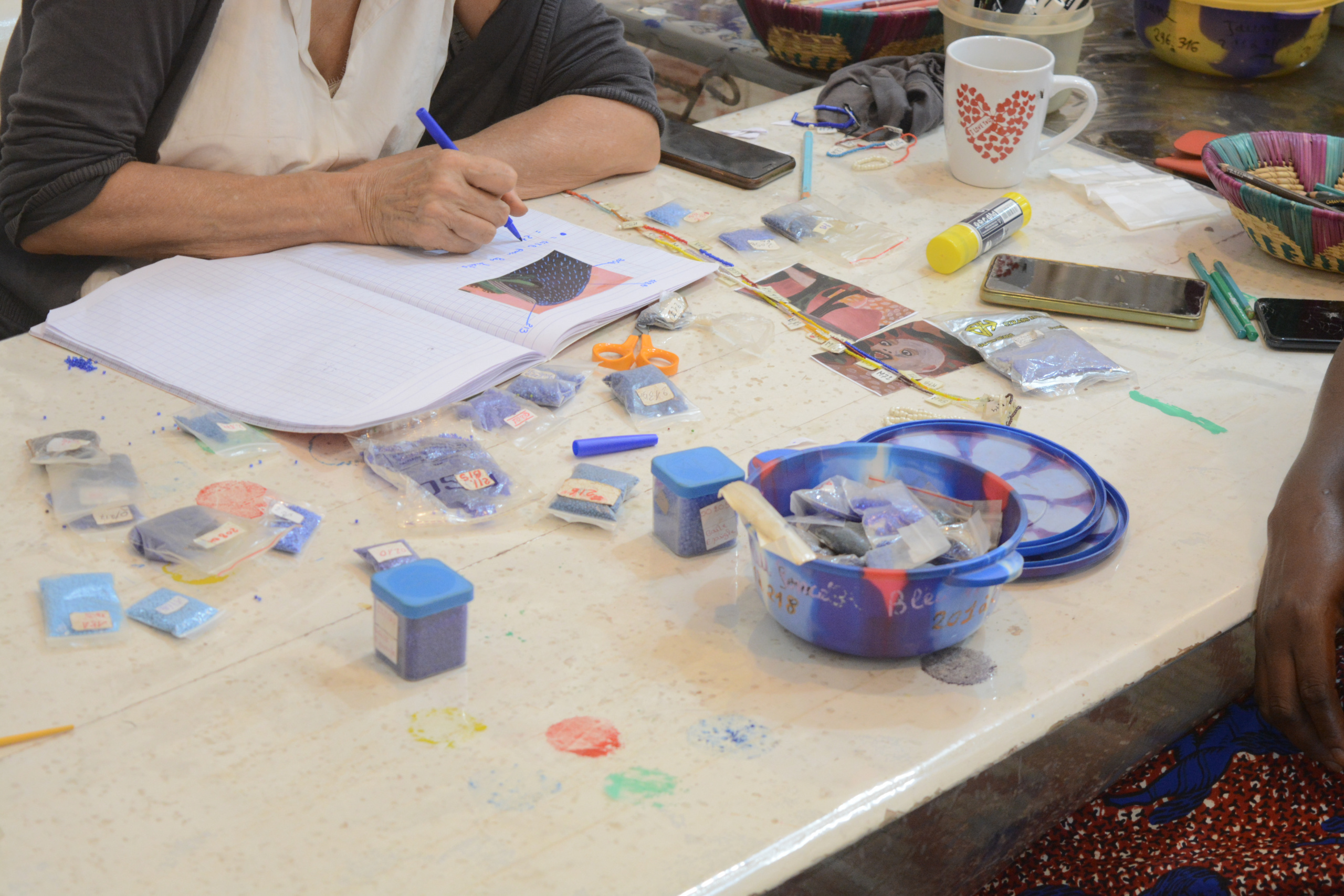 Depuis 2006, l’atelier d’Yveline Tropéa réunit huit femmes dans une véritable compagnie artistique. Dans cet espace baigné de lumière africaine, des milliers de perles colorées attendent d’être transformées en récits visuels.